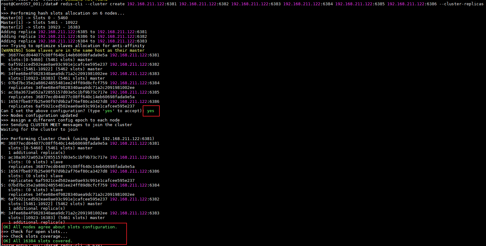 redis-cli –cluster create 192.168.211.122:6381 192.168.211.122:6382 192.168.211.122:6383 192.168.211.122:6384 192.168.211.122:6385 192.168.211.122:6386 –cluster-replicas 1