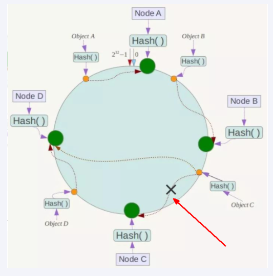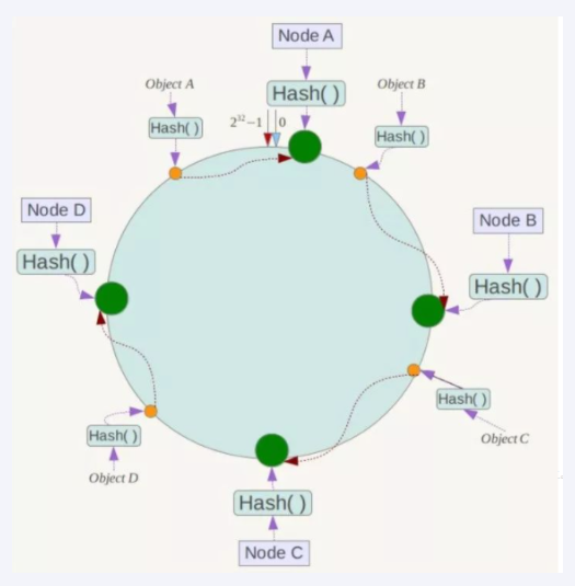如,我们有Object A,Object B,Object C,Object D四个数据对象,经过哈希计算后,在环空间上的位置如下所示,根据一致性Hash算法,数据A会被定位到Node A上,B被定位到Node B上,C被定位到Node C上,D被定位到Node D上。