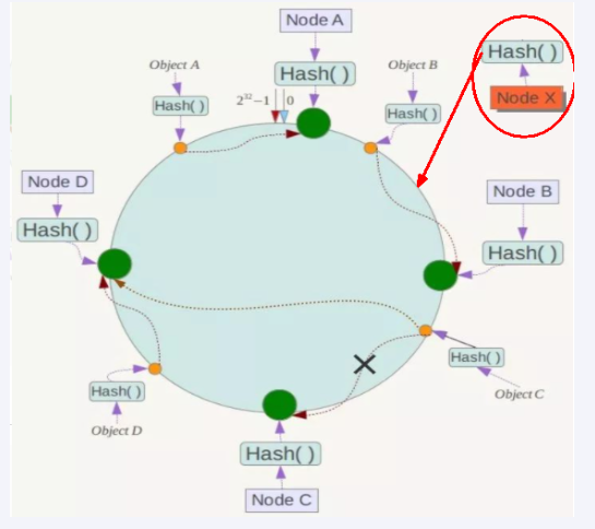 服务器数量增加了,只需要加一台节点Node X,X的位置在A和B之间,那受到影响的也就是A和B之间的数据,重新把A和X的数据录入到X上即可,不会导致Hash取余全部数据重新洗牌。如下图