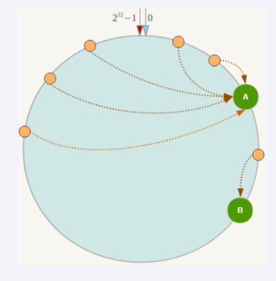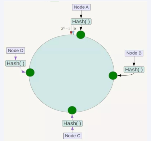 2^32取模,简单来说,一致性Hash算法将整个哈希值空间组织成一个虚拟的圆环,如假设某哈希函数H的值空间为0-2^32-1(即哈希值是一个32位无符号整形),整个哈希环如上图:整个空间按顺时针方向组织,圆环的正上方的点代表0,0点右侧的第一个点代表1,以此类推2,3,4,…..直到2^32-1,也就是说0点左侧的第一个点代表2^32-1,0和2^32-1在零点中方向重合,我们把这个由2^32个点组成的圆环成为Hash环