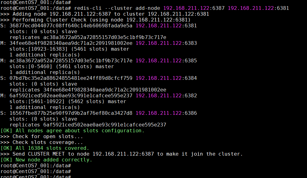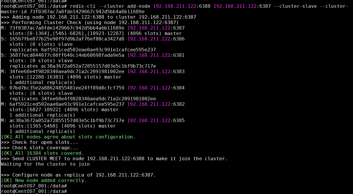 root@CentOS7_001:/data# redis-cli --cluster add-node 192.168.211.122:6388 192.168.211.122:6387 --cluster-slave --cluster- master-id 73f0387ac7a8fde1429667c942d5bb4a6b11689e