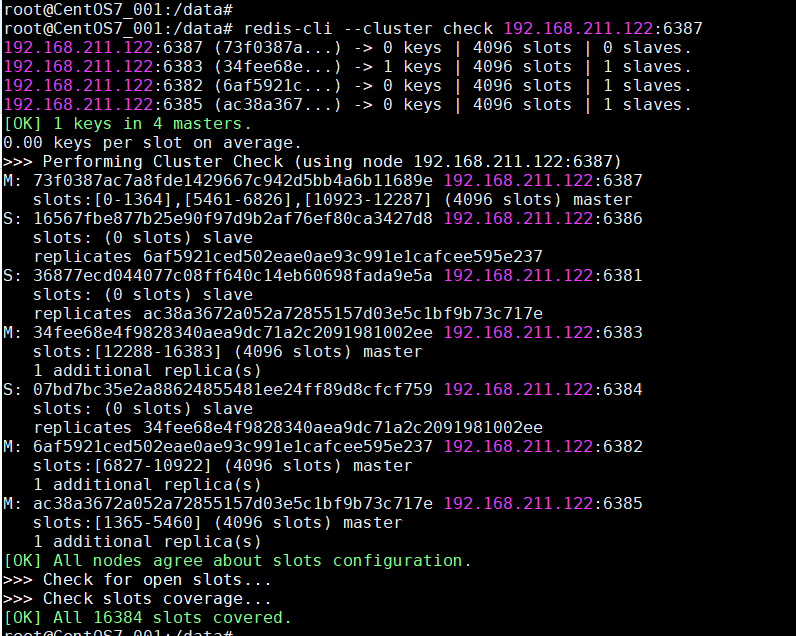 38root@CentOS7_001:/data# redis-cli --cluster check 192.168.211.122:6387