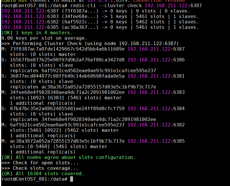1 | root@CentOS7_001:/data# redis-cli --cluster check 192.168.211.122:6381 |